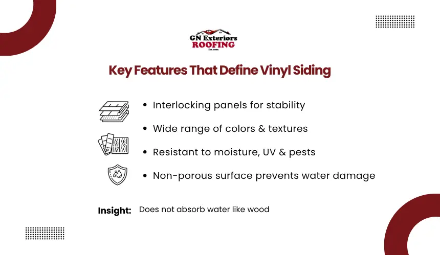After understanding what vinyl siding is, the next step is to look at the characteristics that define how it is built and how it performs as a material. These features are inherent to the product itself and explain why it behaves differently from other exterior cladding options.